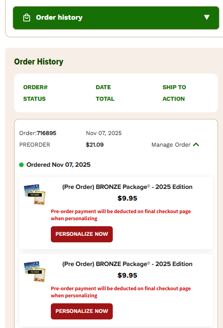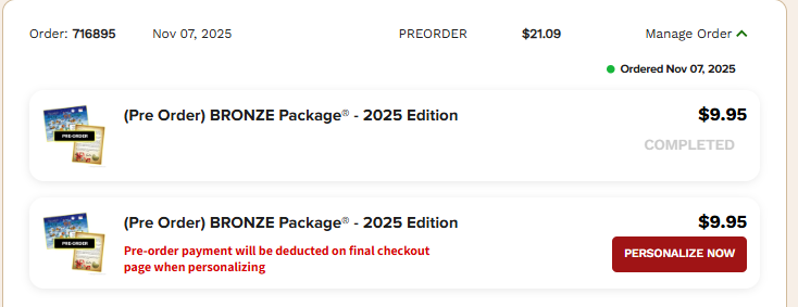 - If you have multiple Pre-orders to personalize: Go back to your Member Account each time to click on the next 'Personalize Now' button in your original 'Pre-Order' number.
